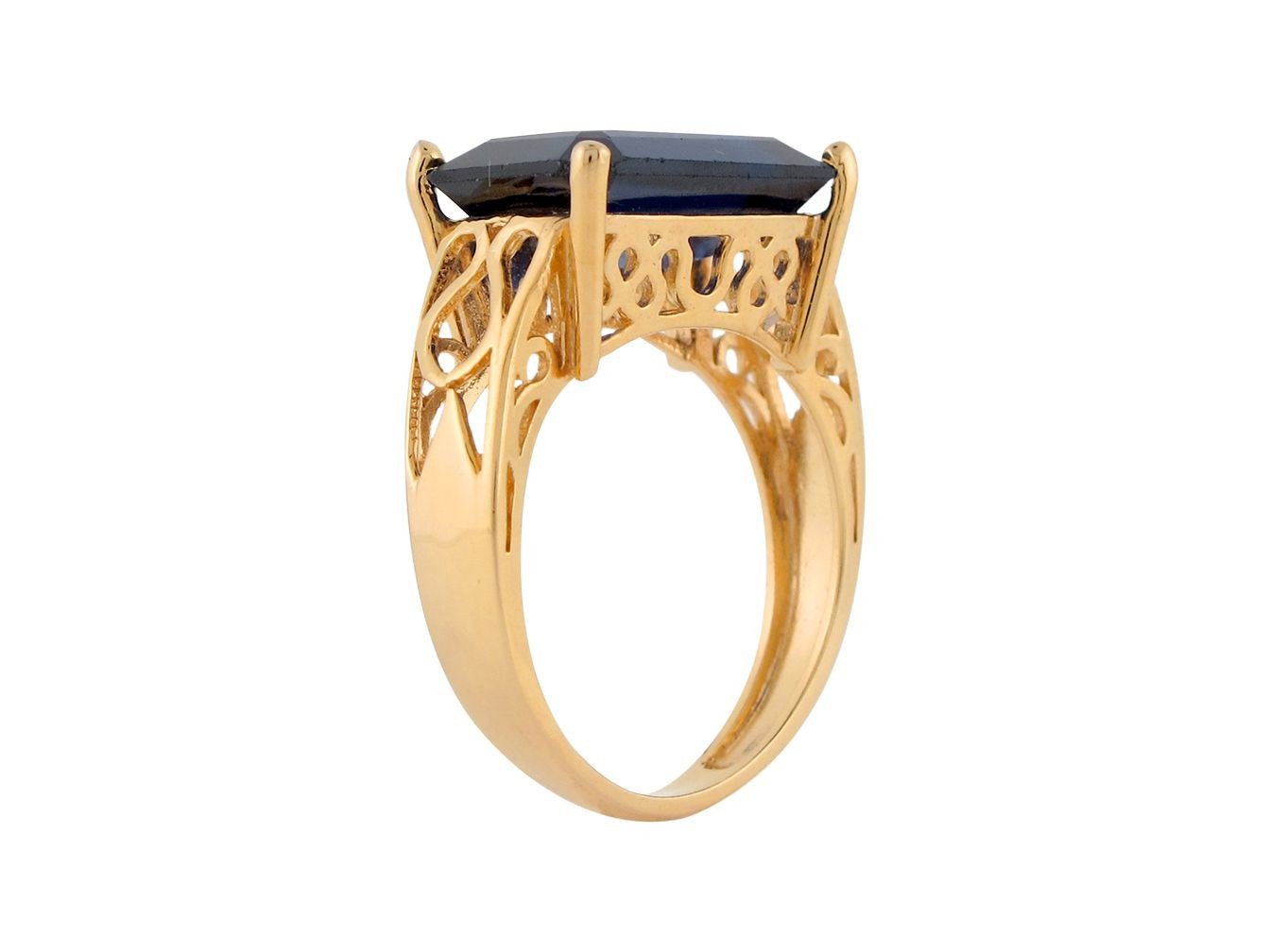 A lovely Simulated Sapphire adorns this marvelous 10k Yellow Gold ladies cocktail ring. The magnificent filigree design that is incorporated into the band of the ring further increases the "wow" factor. This ring is a fine piece of jewelry that will compliment any wardrobe. Our rings are proudly handcrafted in our California factory.