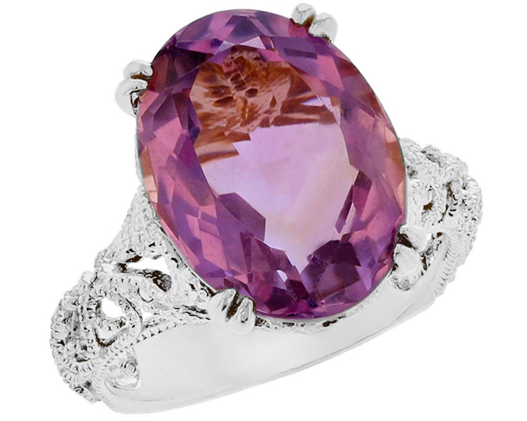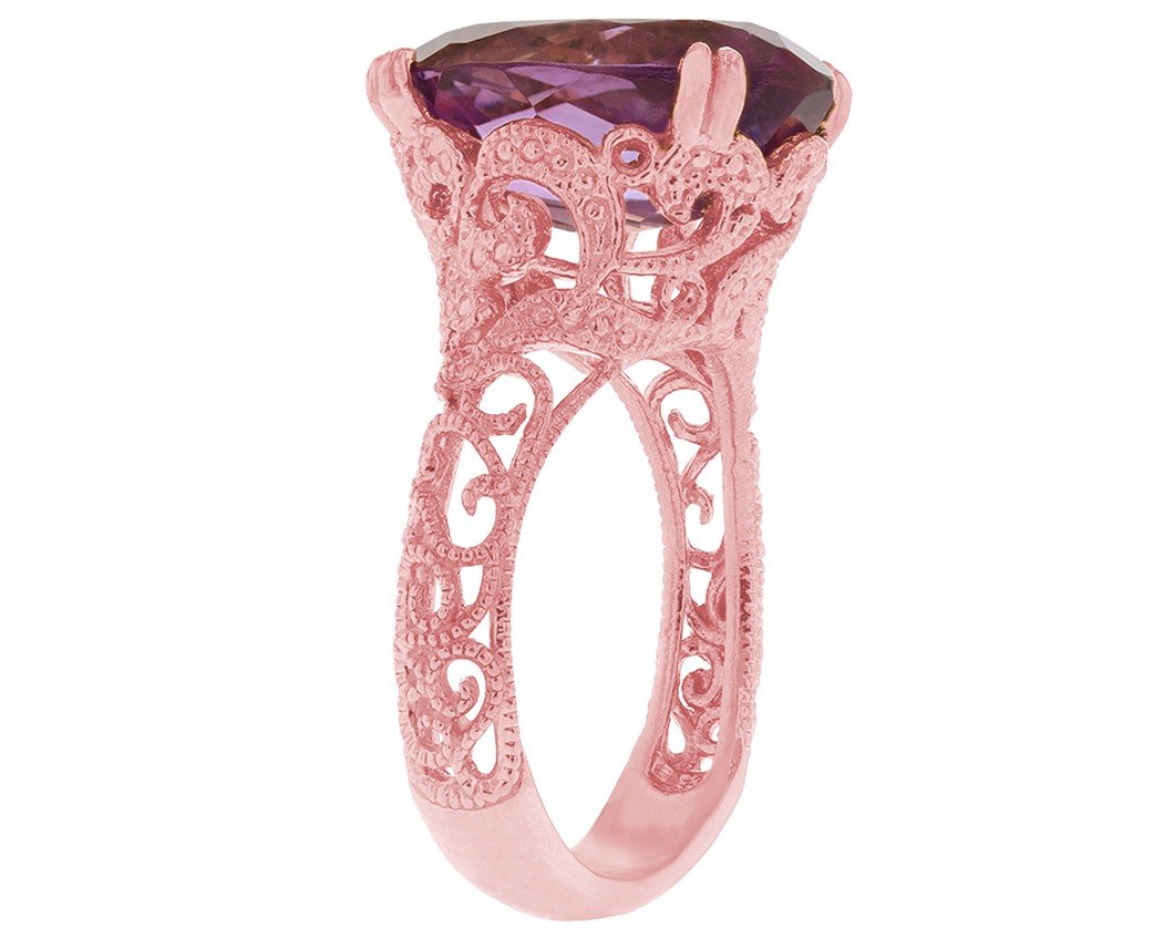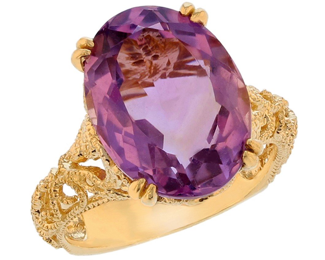 This breathtaking cocktail ring is magnificently set with a gorgeous natural Amethyst. To further add to the alluring look of the piece, double claw prongs are used to securely hold the center stone. A dazzling and high detail design is present on the shanks of the ring and complete the look. Only fine 10k Yellow Gold is used to craft this exquisite ring. All of our rings are proudly handcrafted in our California factory.