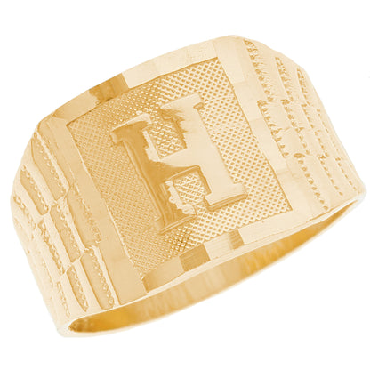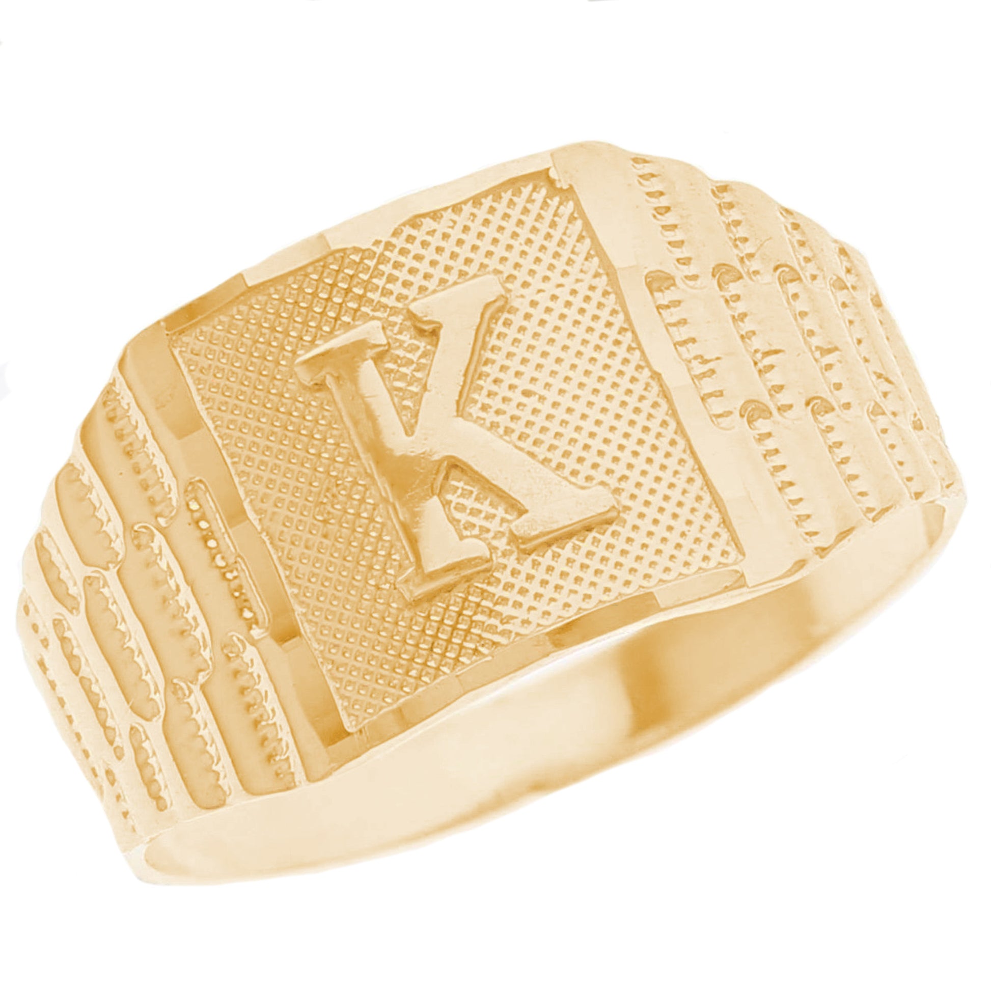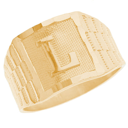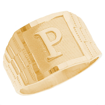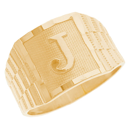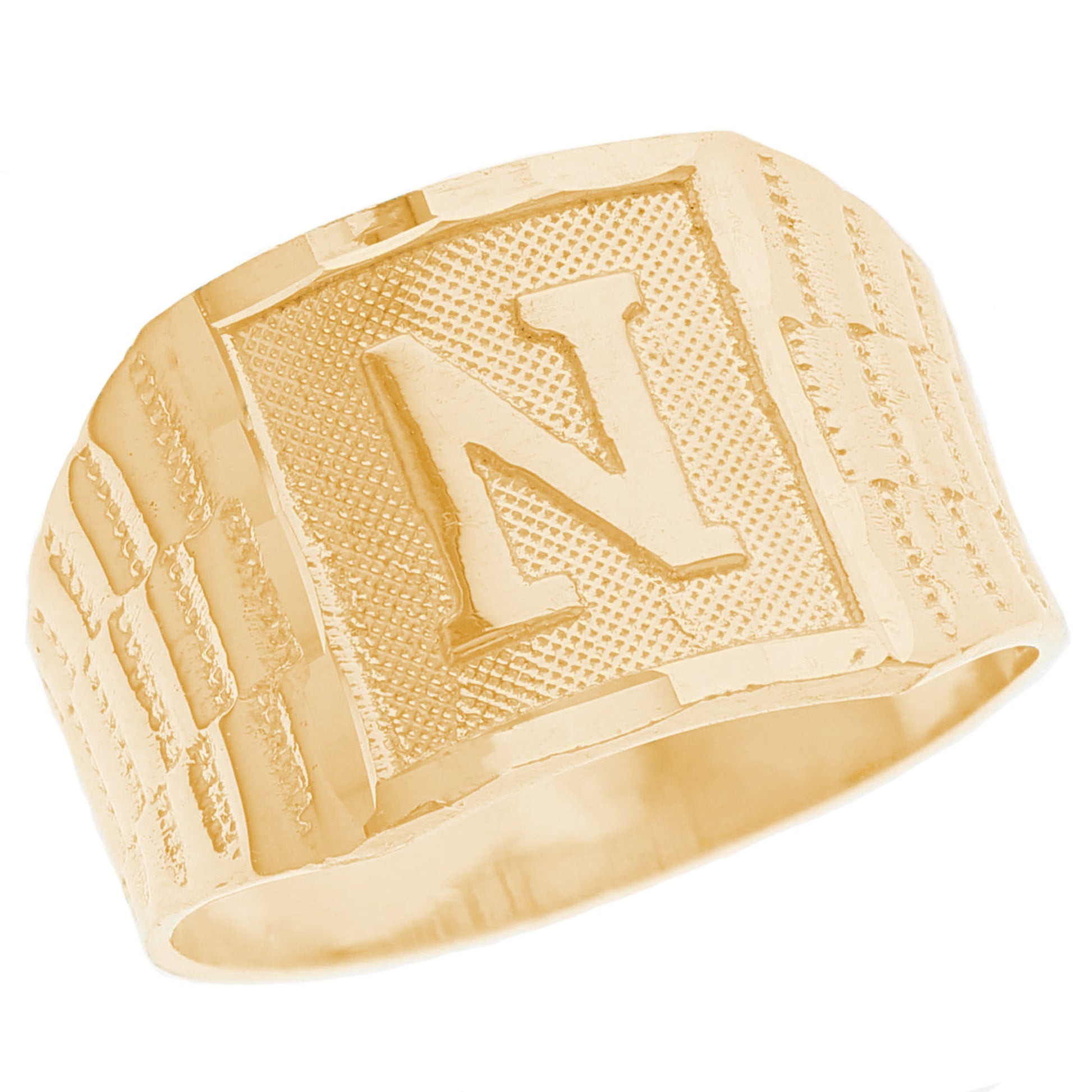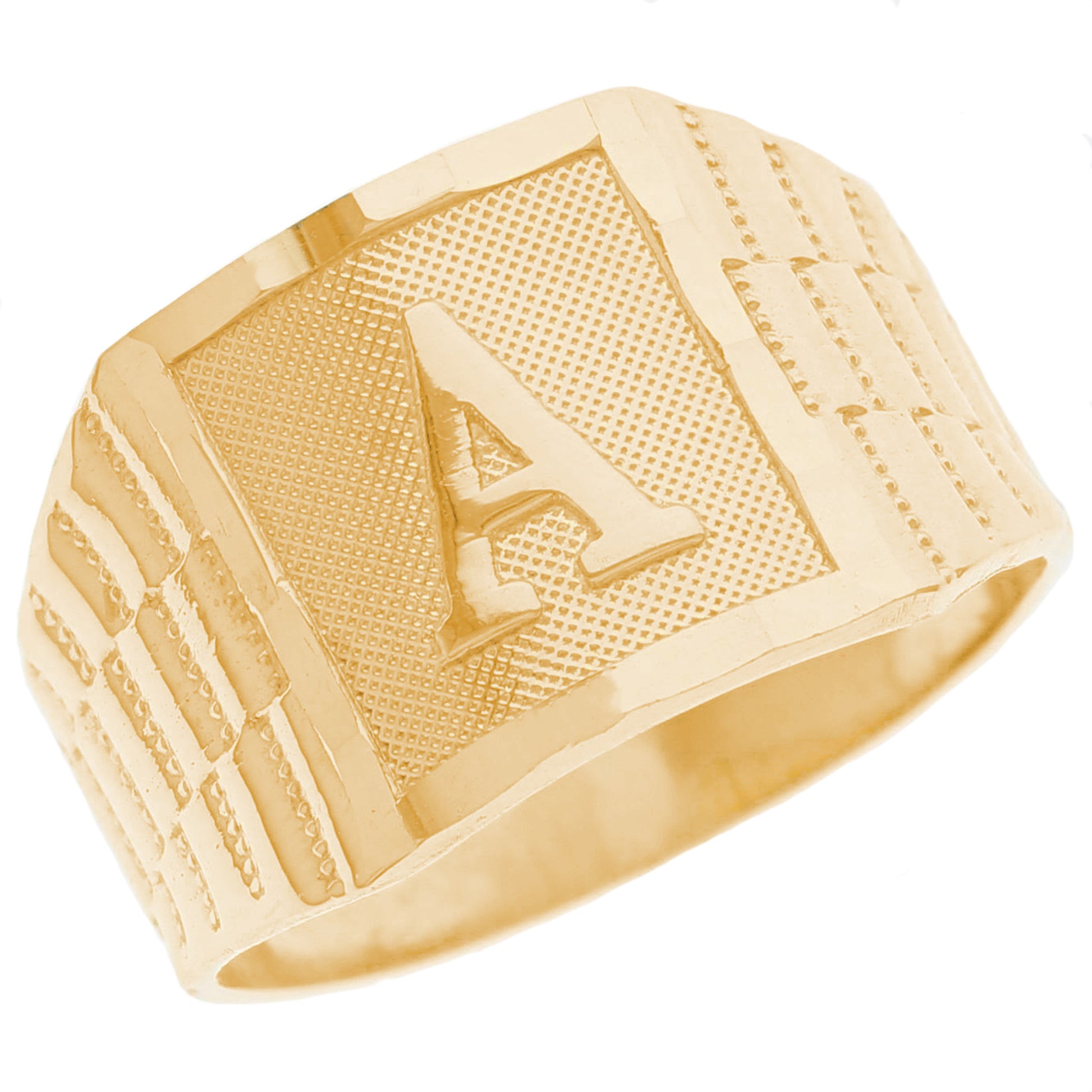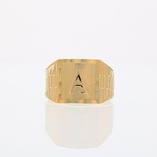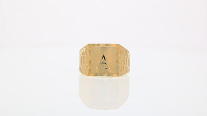 The 10k Yellow Gold Large A Mens Ring from emgeedi is a stylish and timeless piece that is perfect for everyday wear. Made in the USA at a California based factory, this ring is crafted from high-quality 10k Yellow Gold and features a bold initial A design.The shanks of the ring feature a classic and elegant watch band design that is sure to add to any collection. With no stones, this ring is perfect for those who prefer a minimalist and understated look. Whether worn on its own or stacked with other rings, this piece is sure to make a statement. Add a touch of personalized style to your wardrobe with the JackAni 10k Yellow Gold Large A Mens Ring.