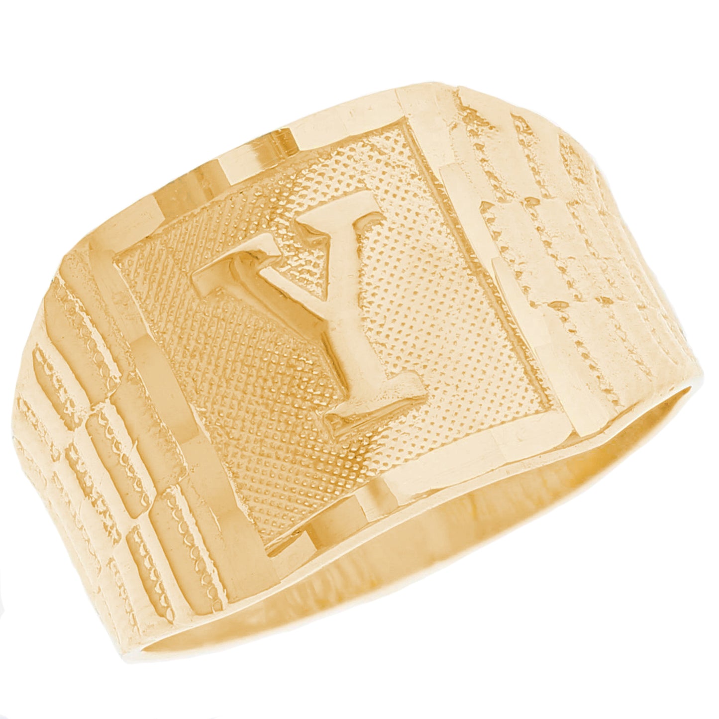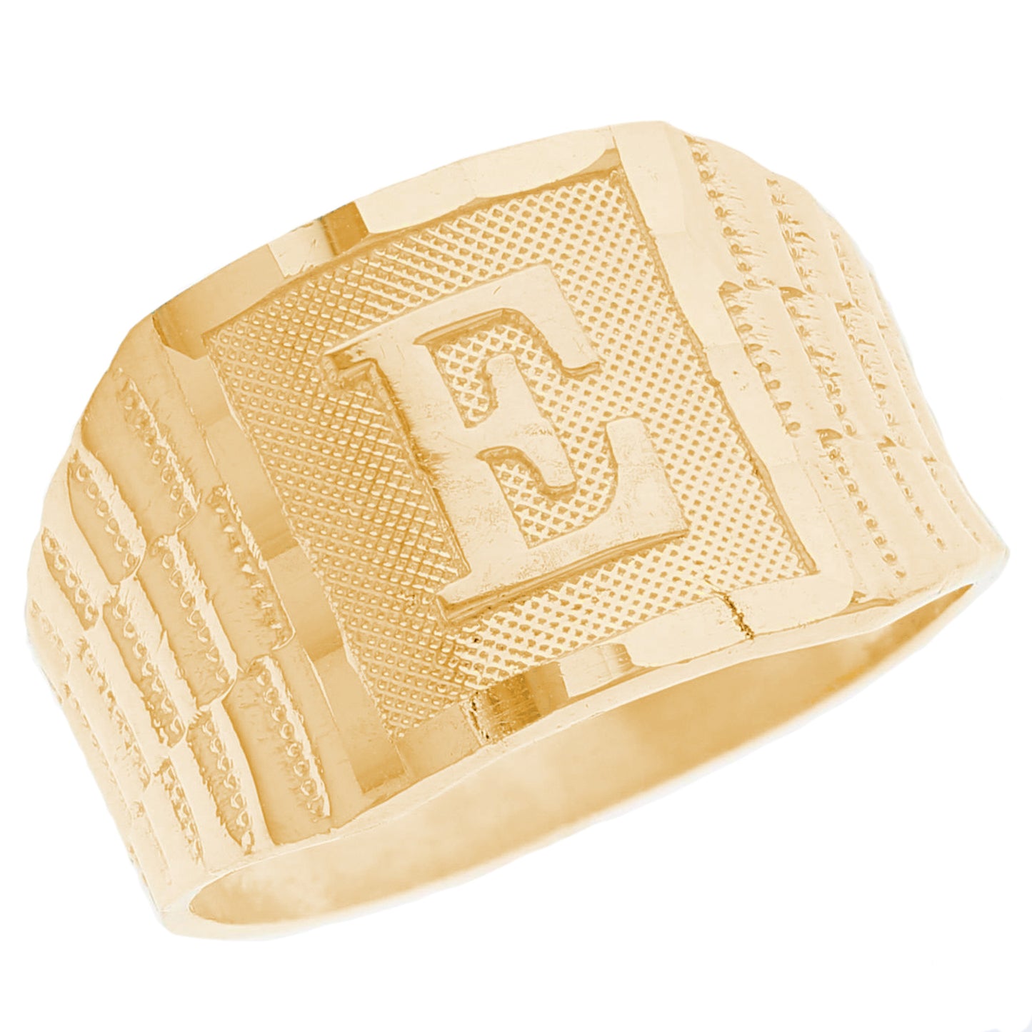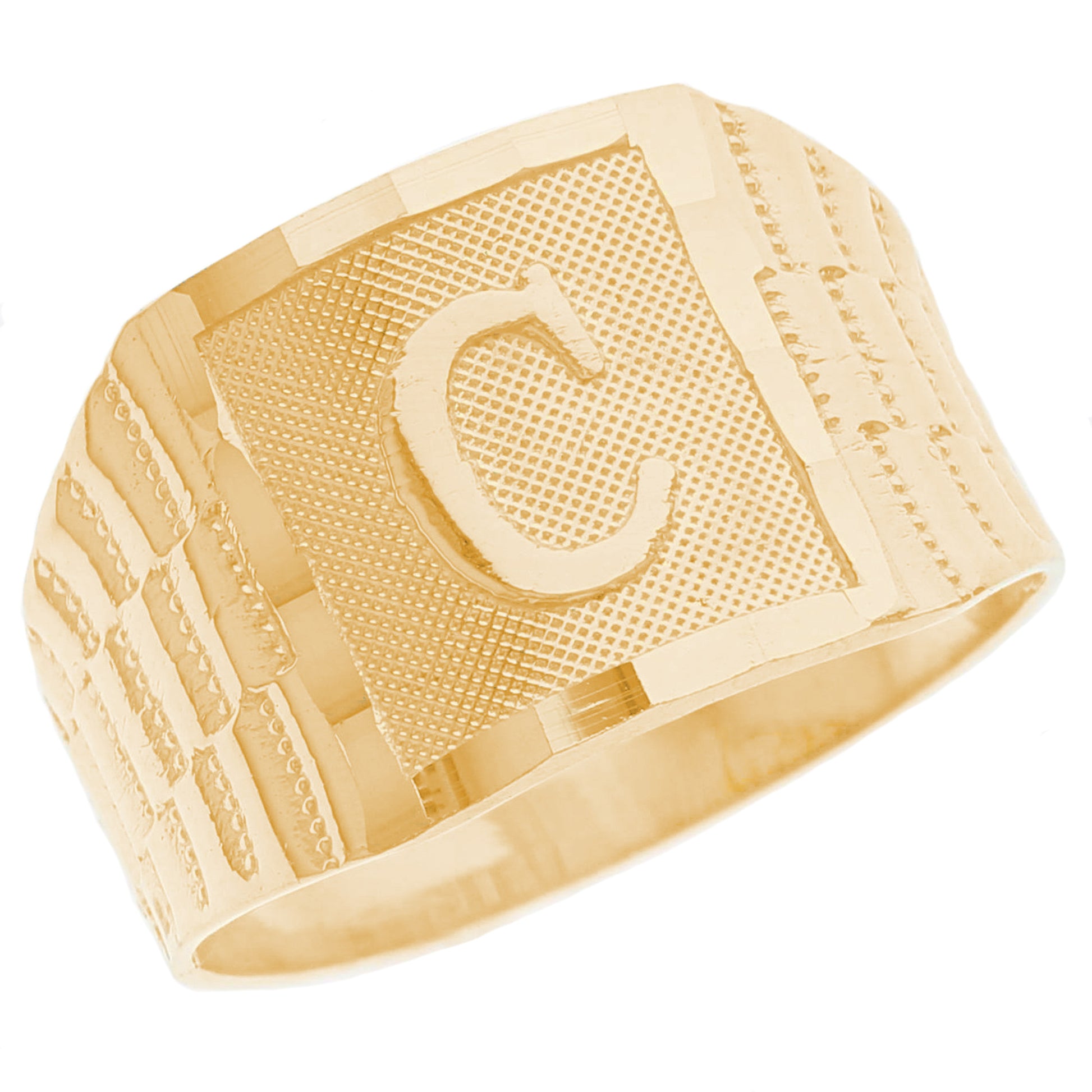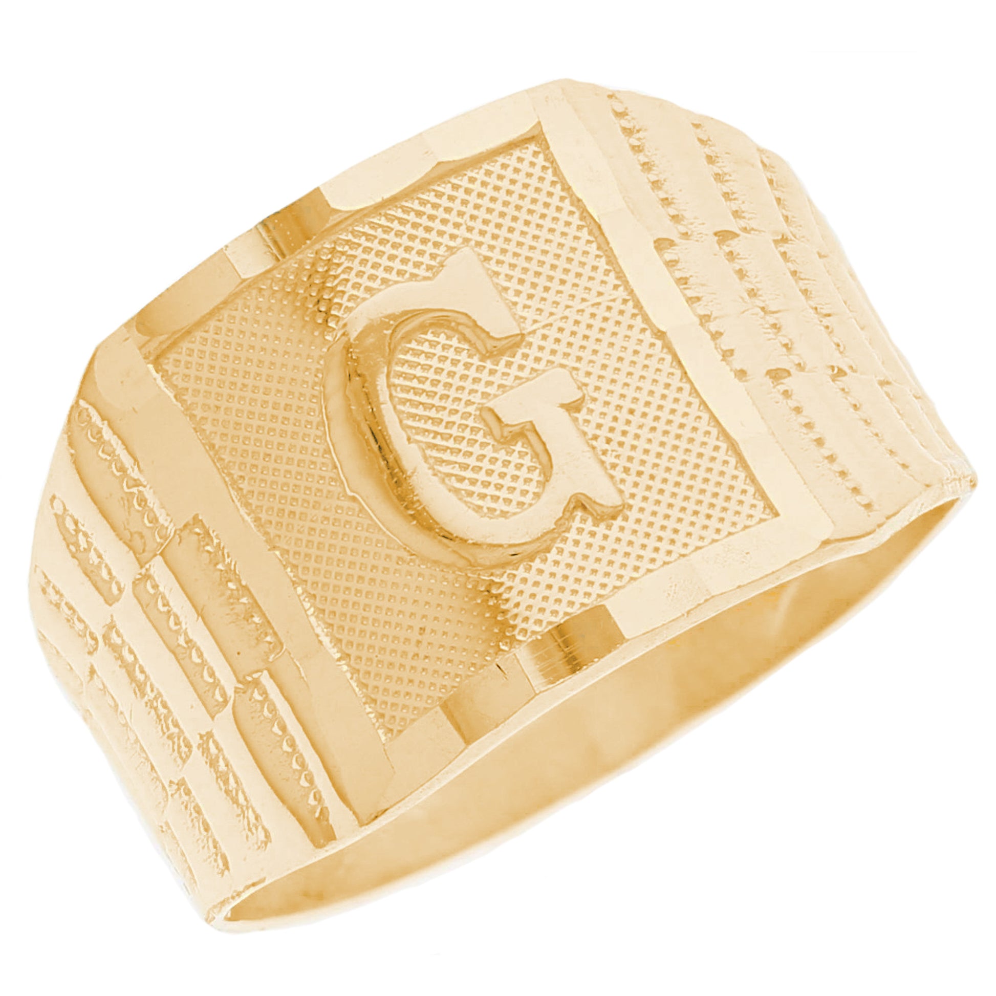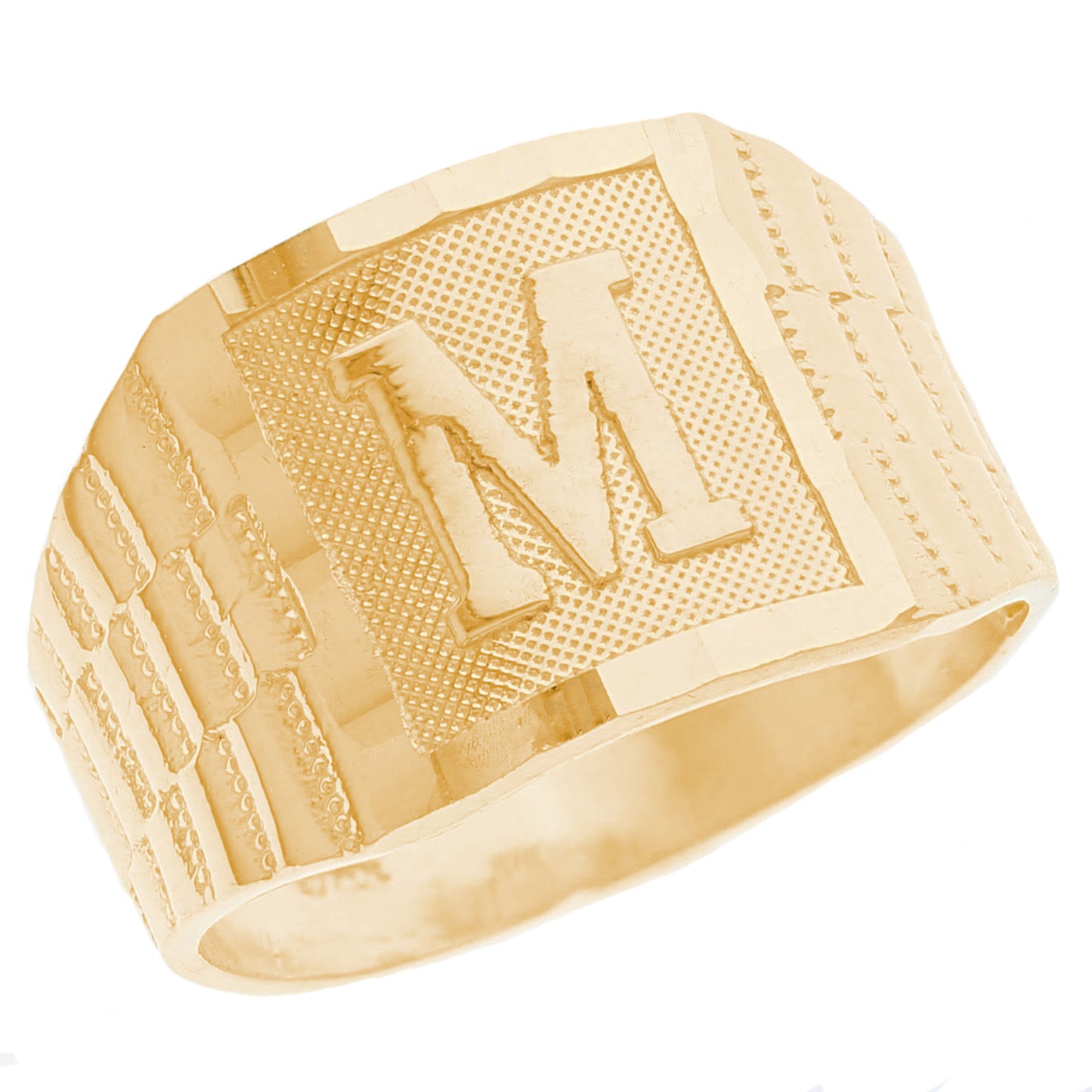 The 10k Yellow Gold Large A Mens Ring from emgeedi is a stylish and timeless piece that is perfect for everyday wear. Made in the USA at a California based factory, this ring is crafted from high-quality 10k Yellow Gold and features a bold initial A design.The shanks of the ring feature a classic and elegant watch band design that is sure to add to any collection. With no stones, this ring is perfect for those who prefer a minimalist and understated look. Whether worn on its own or stacked with other rings, this piece is sure to make a statement. Add a touch of personalized style to your wardrobe with the JackAni 10k Yellow Gold Large A Mens Ring.