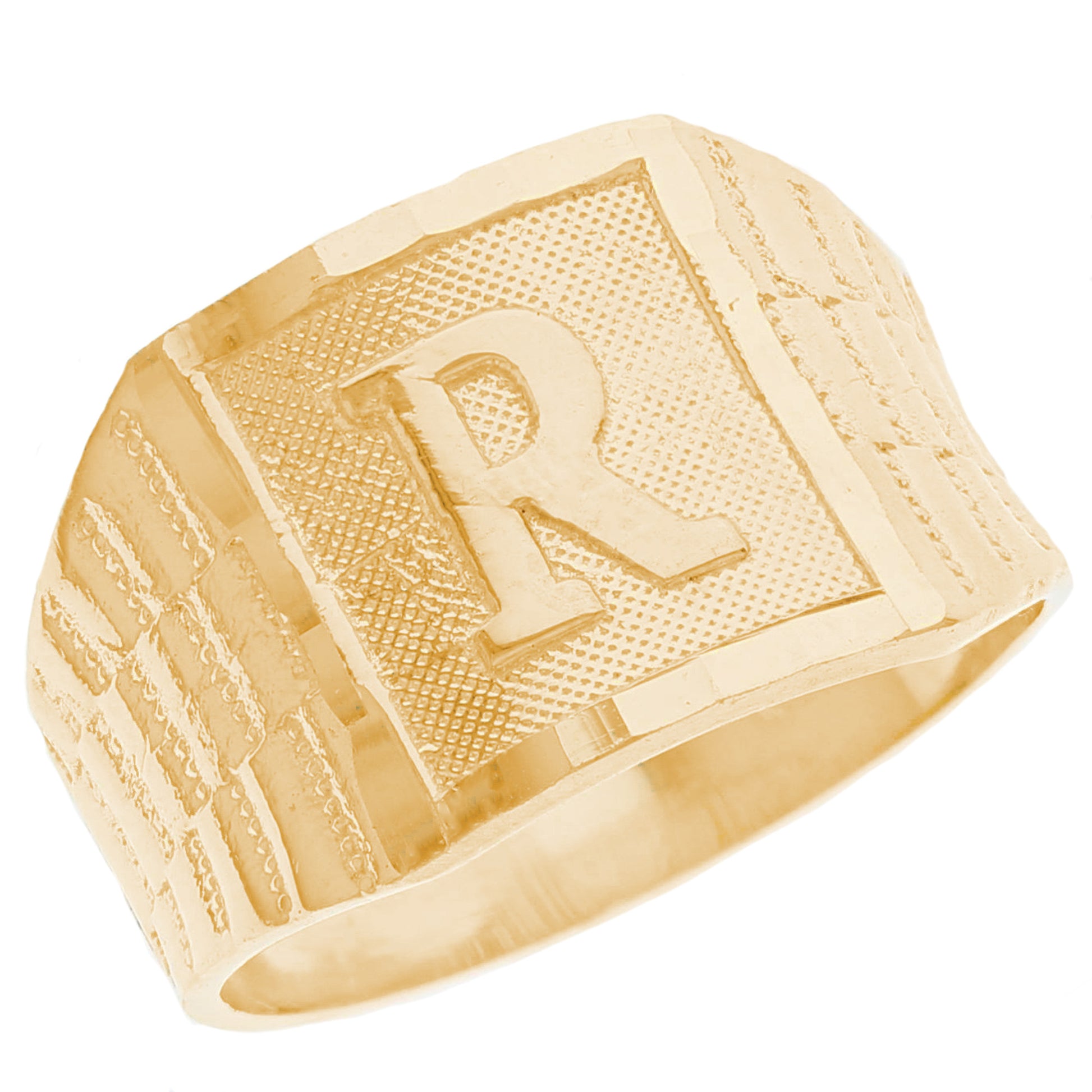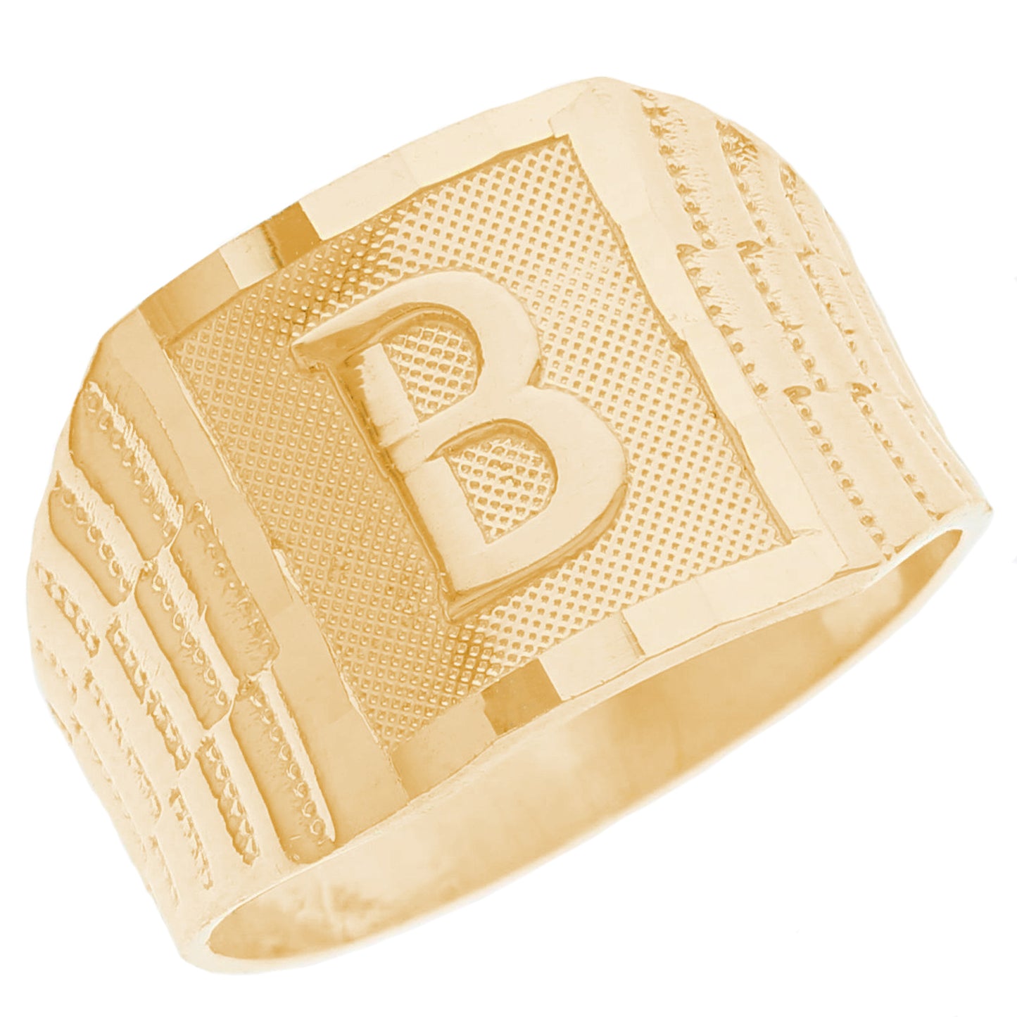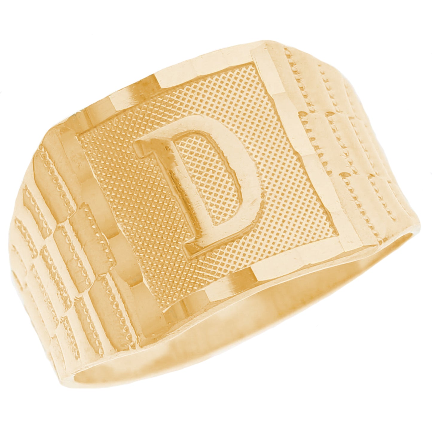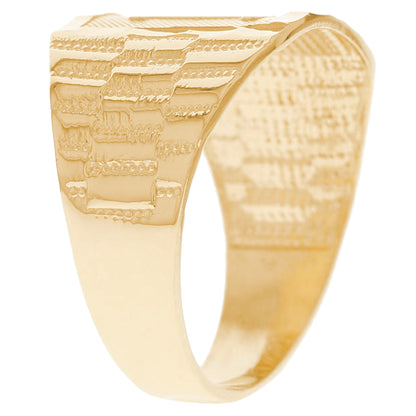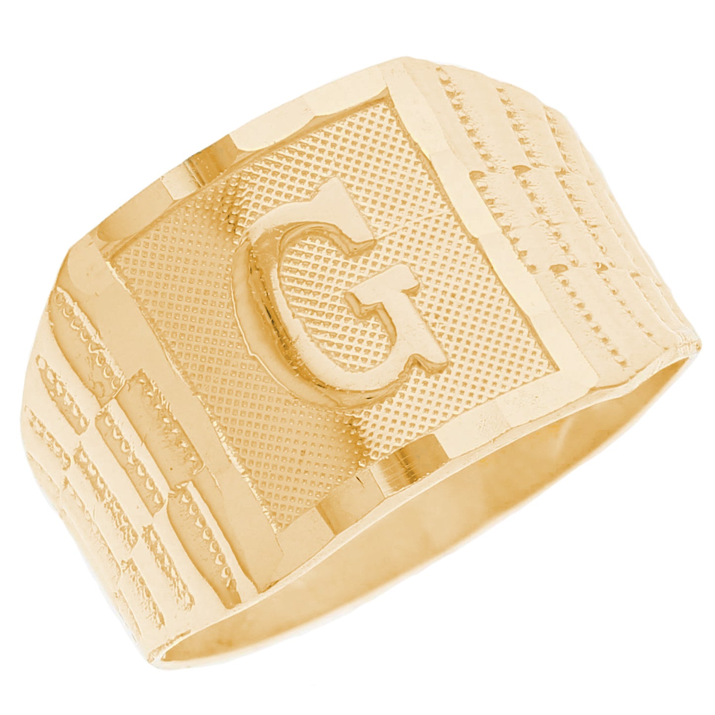 The 10k Yellow Gold Large A Mens Ring from emgeedi is a stylish and timeless piece that is perfect for everyday wear. Made in the USA at a California based factory, this ring is crafted from high-quality 10k Yellow Gold and features a bold initial A design.The shanks of the ring feature a classic and elegant watch band design that is sure to add to any collection. With no stones, this ring is perfect for those who prefer a minimalist and understated look. Whether worn on its own or stacked with other rings, this piece is sure to make a statement. Add a touch of personalized style to your wardrobe with the JackAni 10k Yellow Gold Large A Mens Ring.